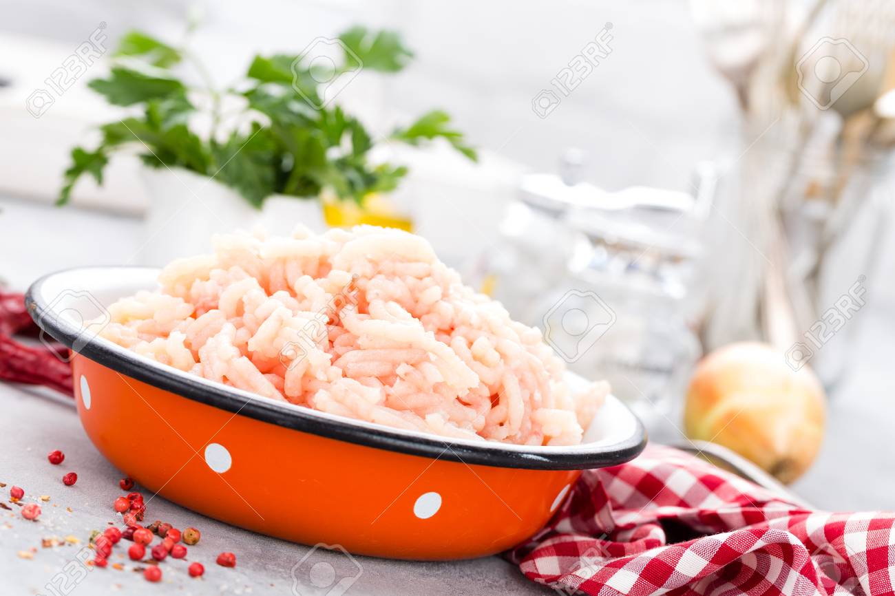 Forcemeat Raw Ground Chicken Meat In Bowl On White Kitchen Table