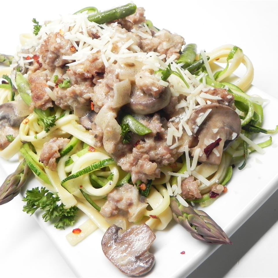 Fettuccine And Zoodles Topped With Chicken Sausage Asparagus And Mushrooms