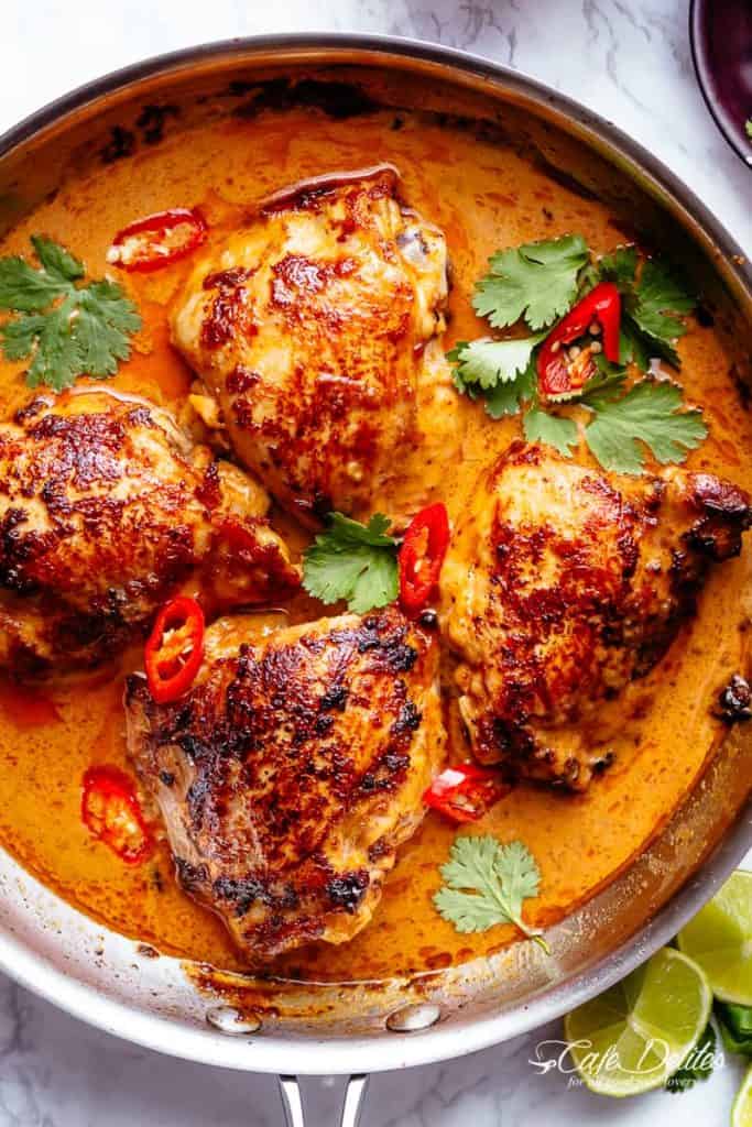 Simmer uncovered for 5 minutes or until chicken juices run clear stirring frequently. Return the chicken to the pan and add the chopped coriander.