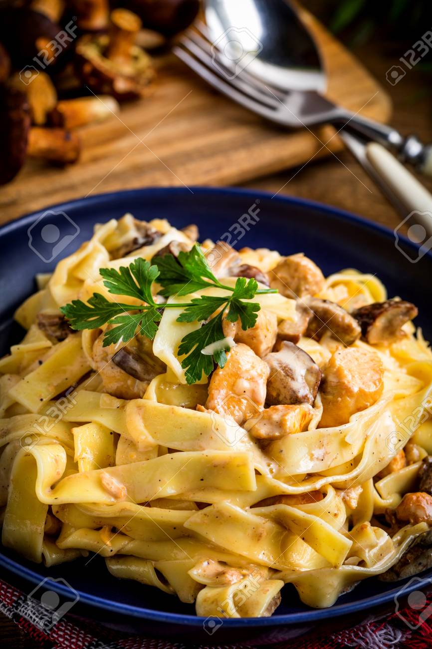 Tagliatelle Pasta With Forest Mushrooms And Chicken Small Depth