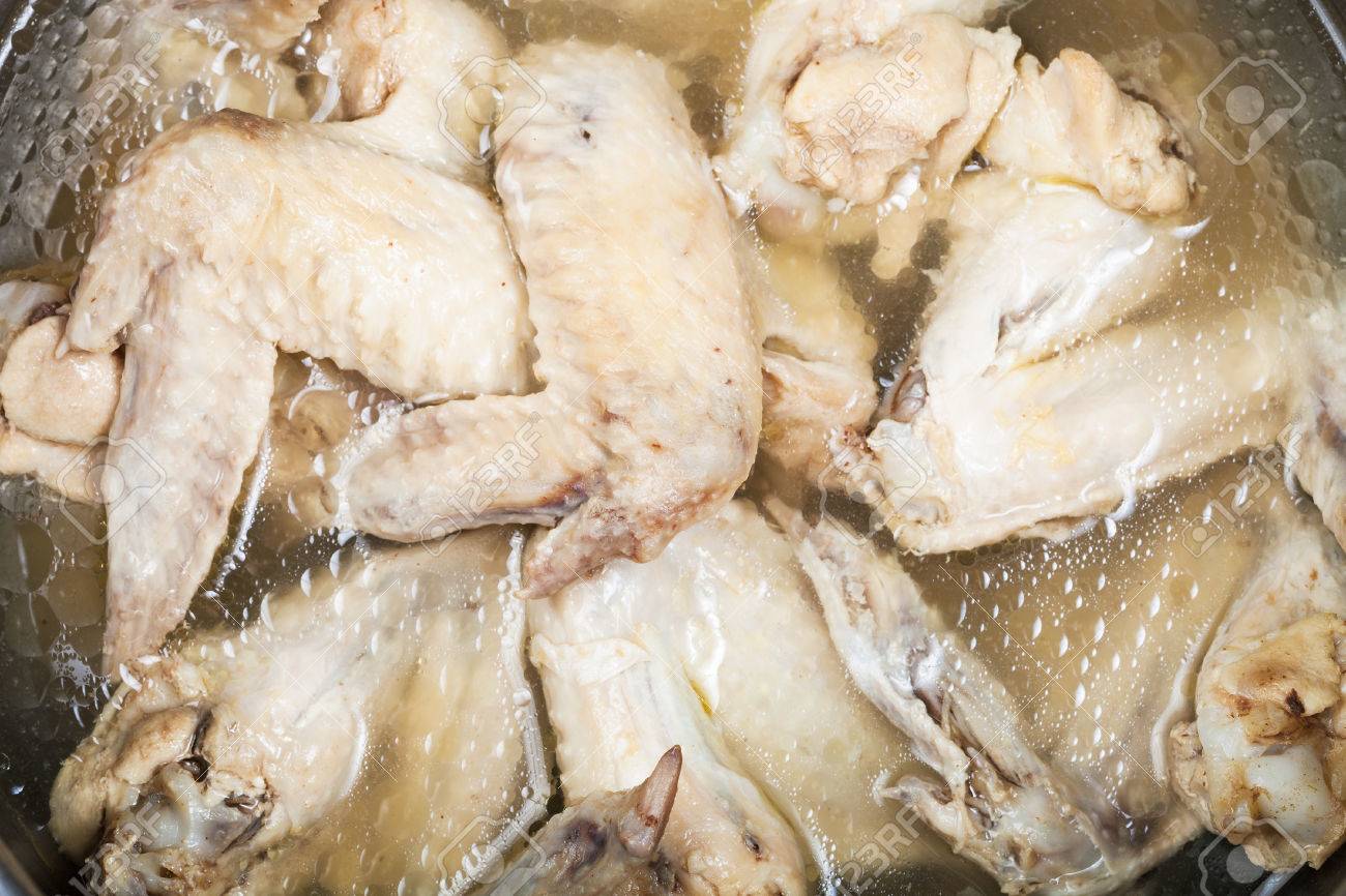 Many Boiled Chicken Wings In Greasy Chicken Bouillon In Stewpan