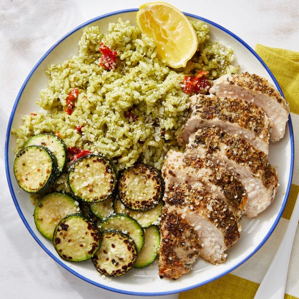 Seared Chicken Zucchini With Pesto Rice Parmesan