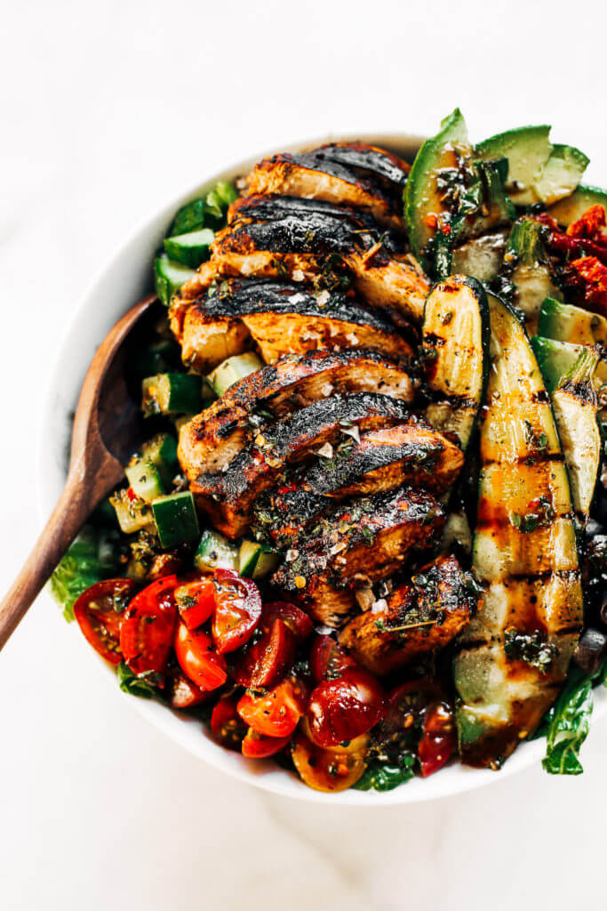 Grilled chicken and vegetable orzo salad the grill is a healthy cooks best friend allowing you to build big flavor and crispiness with minimal added fat. 6 skinned and boned chicken breast halves. Put the zucchini bell pepper and eggplant on a flat surface.