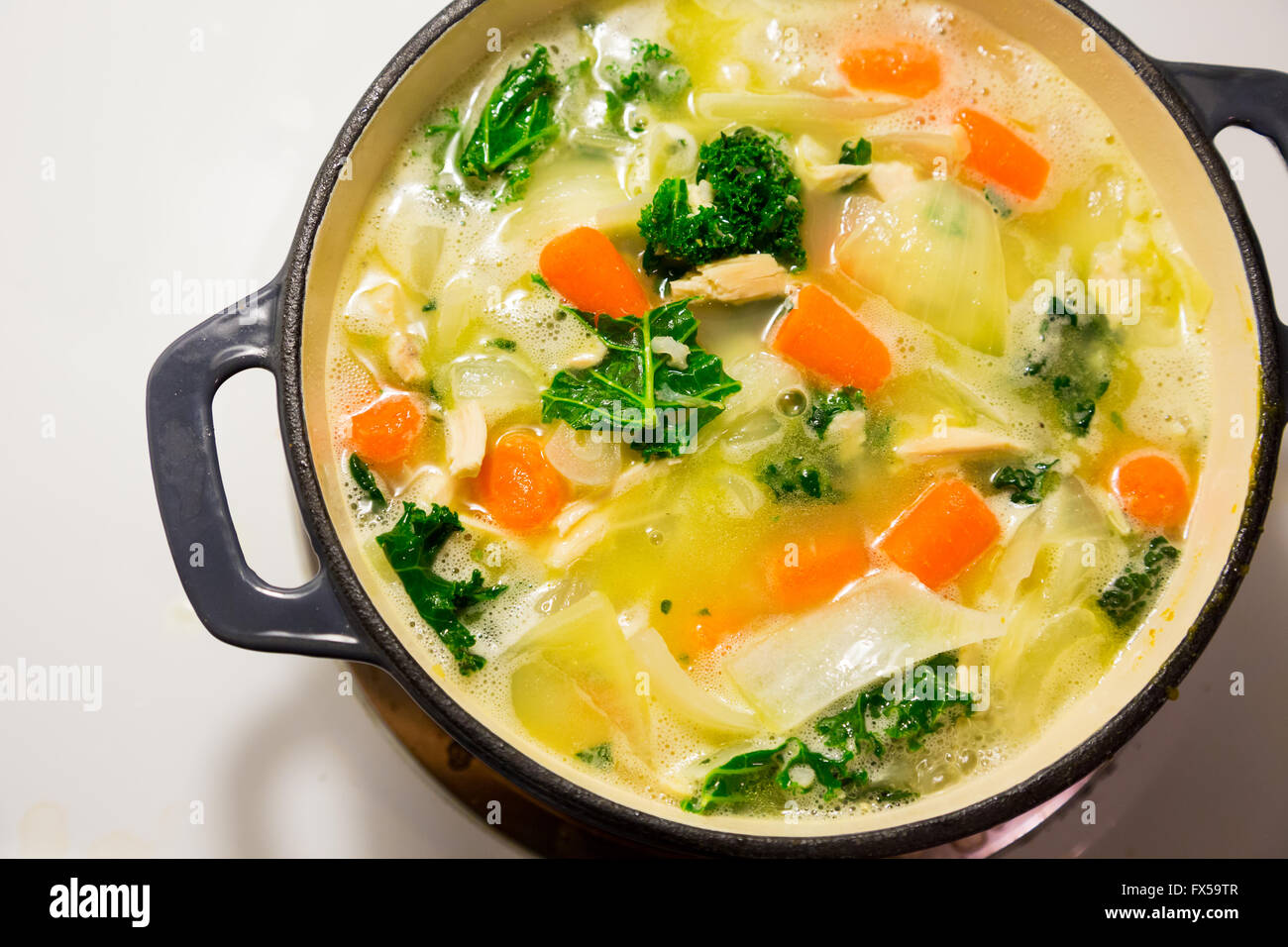 Dutch Oven On A Stove While Cooking Chicken Noodle Soup