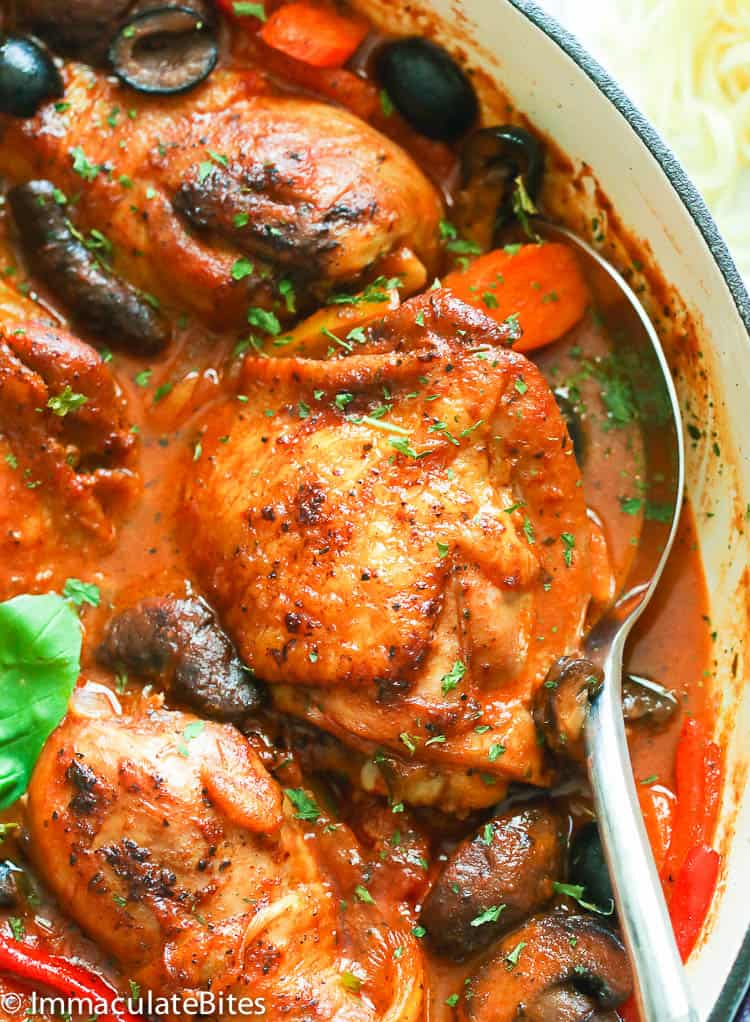 Theres no need to saute the meat or stand over the stove. Place coated chicken in the hot oil in the roasting pan. Just throw all the ingredients like garlic carrots bell peppers onions and olives in your pot with your cacciatore sauce and the juicy chicken breaststhighs will just melt in your mouth.