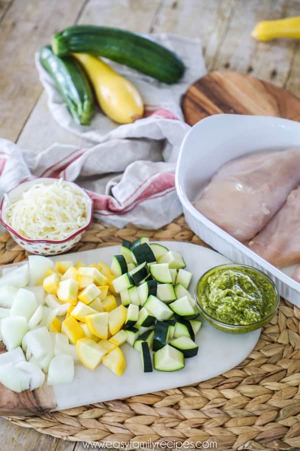 Chop the zucchini squash and onion and combine. In a large casserole dish lay the chicken in a flat single layer and season it with the salt.
